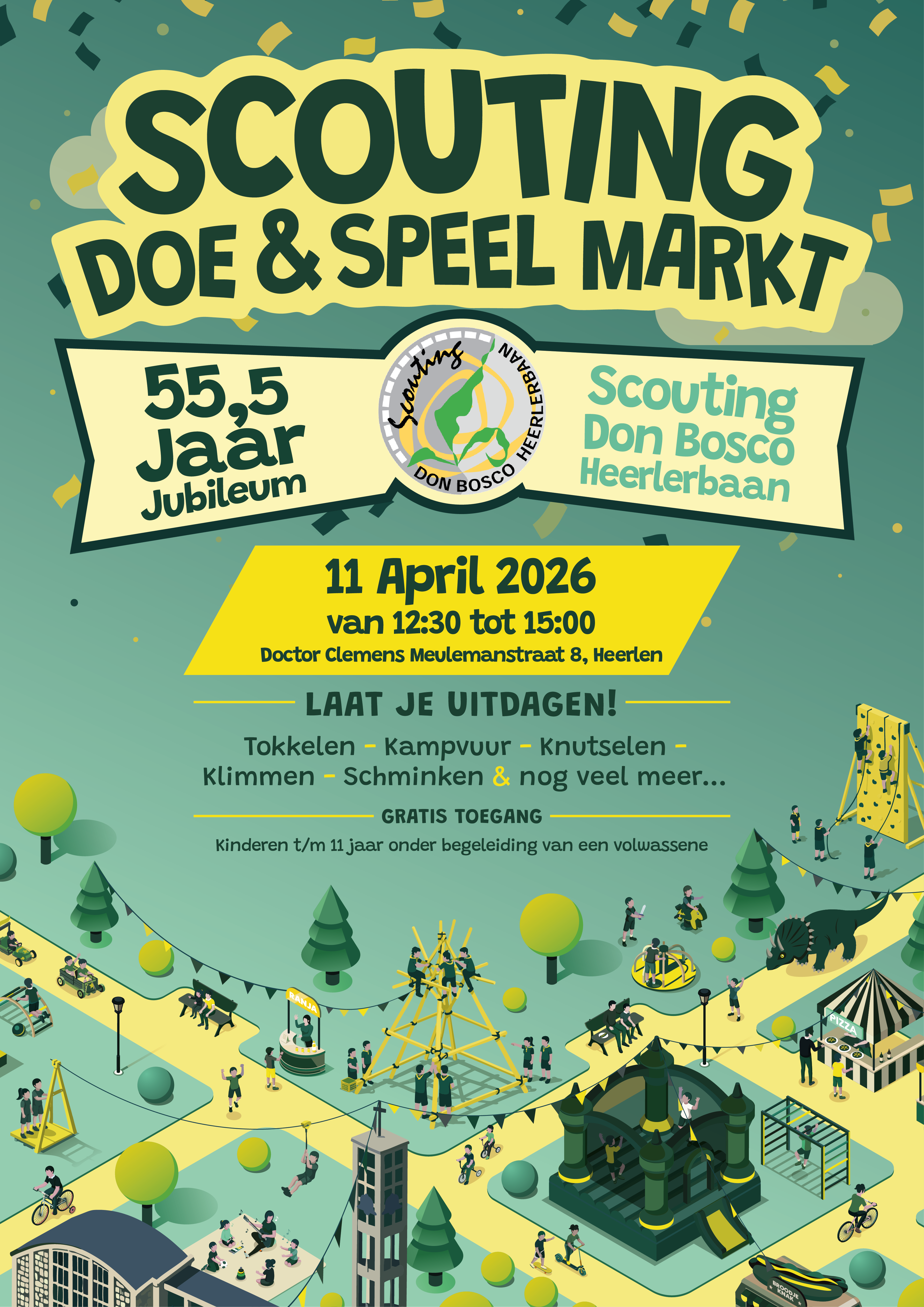 Dit jaar bestaat Scouting Don Bosco Heerlerbaan maar liefst 55,5 jaar en dat laten wij natuurlijk niet onopgemerkt voorbijgaan. Daarom organiseren wij op zaterdag 11 april een feestelijk jubileumprogramma. Een mooie gelegenheid om aan Heerlen te laten zien wat Scouting Don Bosco voor de kinderen en jongen in de wijk betekent en op welke manier dat ons mooie stadje laat bruisen.
