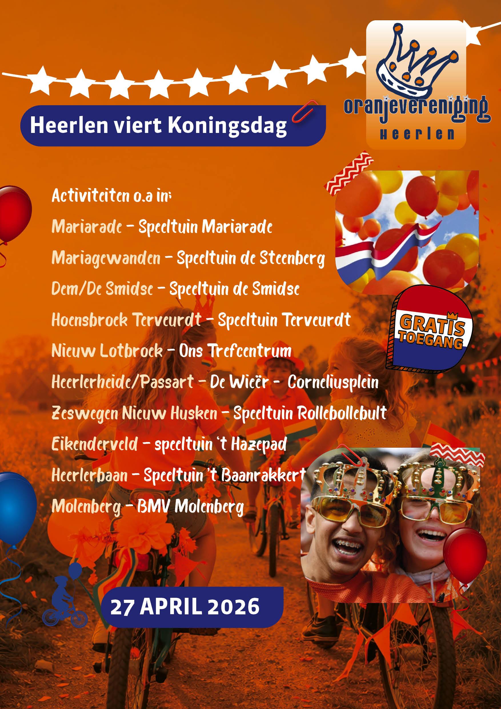 Op Koningsdag , 27 april 2026, zijn er in veel wijken van Heerlen en Hoensbroek oranjefeesten voor kinderen.